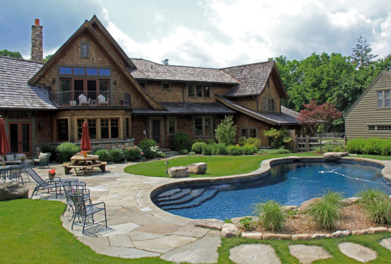 Traditional and elegant describes this pool setting created with 2″ Eased Edge Bluestone Coping and Natural Cleft full color New York Bluestone.