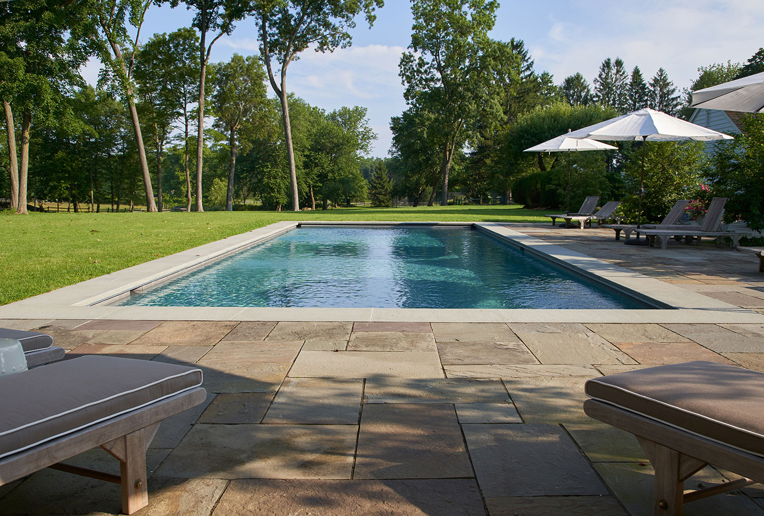 The 24″ wide Bluestone Coping with inlaid patios on each side and grass surroundings has a welcoming feel – even in the heat of mid-summer.